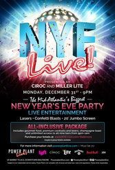 Includes an all-inclusive premium food and bar package from 9pm-1am, champagne toast at midnight, gourmet foods, party favors and access to these venues in Power Plant Live!: Angels Rock Bar, Tin Roof, Howl at the Moon, Mex Tequila Bar, Leinenkugel’s Beer Garden, Luckies Tavern, Luckies Liquors, Mosaic Nightclub, and PBR Baltimore.